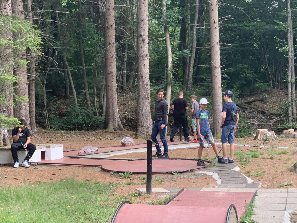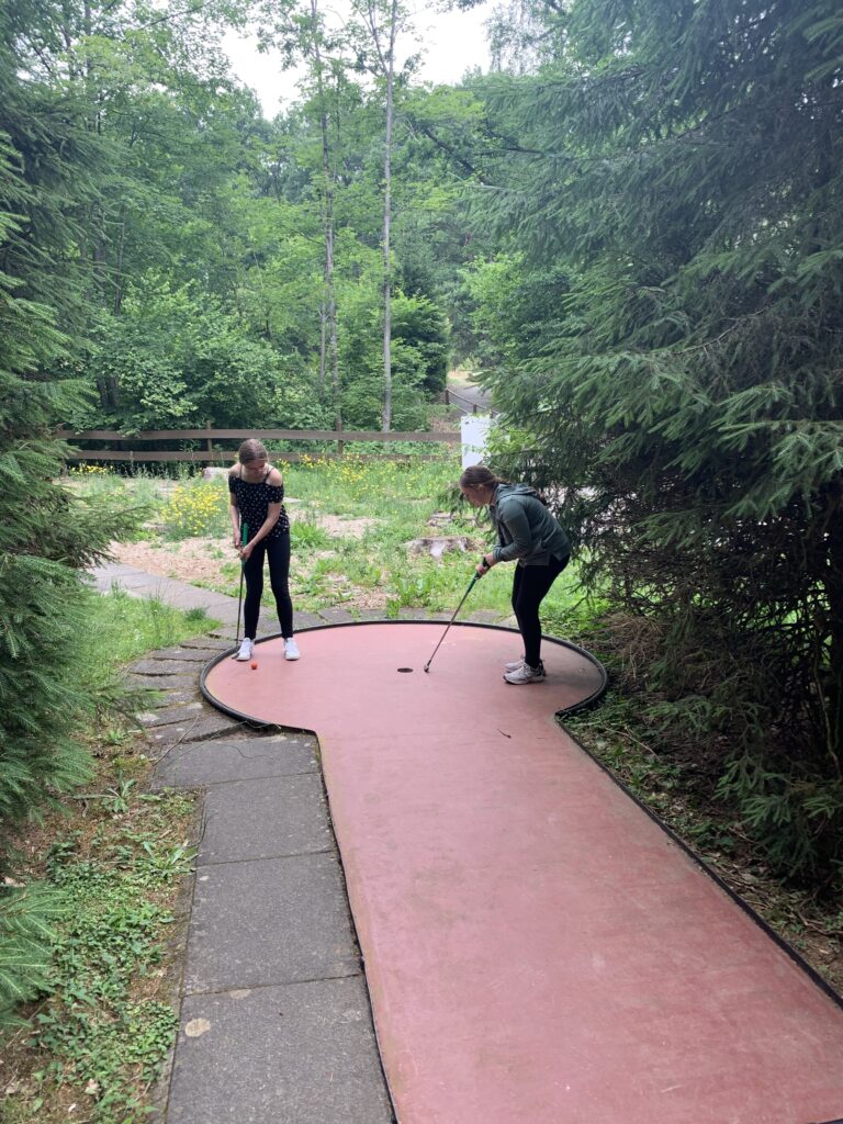 Am dritten Tag der Klassenfahrt ging die Klasse nach dem Frühstück auf die Minigolfanlage, um in vier Gruppen die Bahnen zu bespielen. Konzentration und Geduld waren die Herausforderungen bei diesem Sport. Nach absolvierter Runde ging es weiter zum Schwimmbad des Ferienparks. Dort konnte getaucht, gerutscht, geschwommen und getobt werden. Vor allem die schnelle Rutsche wird den Kindern in Erinnerung bleiben. Am Abend stand das zweite, selbst zu kochende Abendessen auf dem Programm. In allen vier Häusern wurde nach Dienstplan und in Eigenregie alles hergerichtet und zubereitet. Fr. Geppert und Hr. Buchner konnten sich wieder selbst von den köstlichen Speisen überzeugen!
