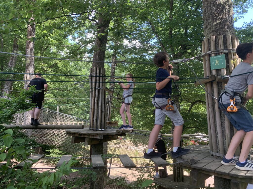 Der Donnerstag begann mit Spiel & Spaß im Ferienpark. Nach einem kurzen Mittagssnack wurde die Klasse mit einem Bus nach Leiwen an der Mosel gefahren. Vor Ort ging die Klasse in den Kletterwald. Alle Kinder wurden zunächst eingewiesen und durchliefen dann in unterschiedlichen Schwierigkeitsstufen den Kletterwald. Vor allem die gegenseitige Unterstützung zur Überwindung der Hindernisse förderte den sozialen Umgang miteinander. Alle Kinder schafften ihre Grenzen zu verschieben und sich teilweise selbst zu überwinden. Von der Angst, die stellenweise zu hören und zu fühlen war, war nach dem Klettern nichts mehr zu spüren.