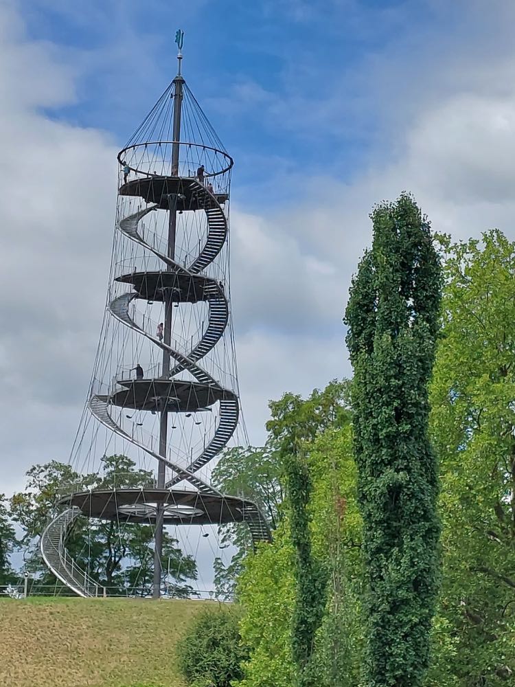 Der Turm hat offene Wendeltreppen, die durch ein Stahlnetz zusammengehalten werden, und einige Schüler überwanden tatsächlich ihre Höhenangst um den tollen Ausblick von oben zu genießen.