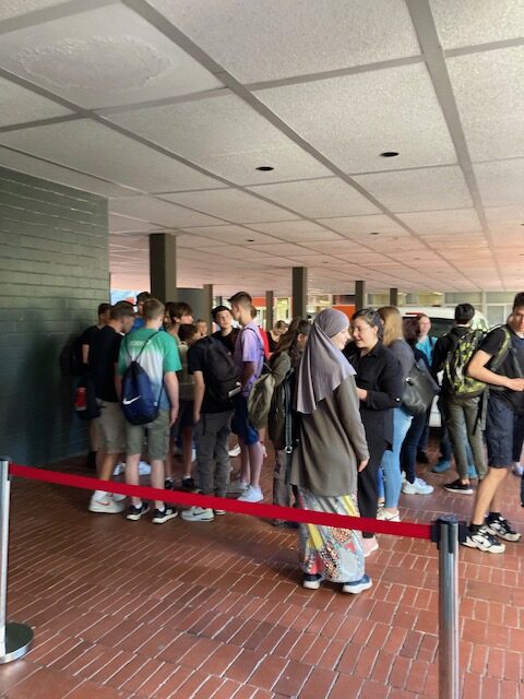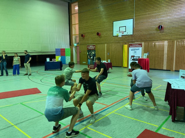 So wurde am Mittwoch die Sporthalle zu einer BO-Veranstaltung mit Workshopcharakter umgestaltet. Schon der Einlass hatte einen besonderen Flair: Wie vor einem Konzert warteten die Neuntklässlerinnen und Neuntklässler mit Spannung auf den Einlass in die Sporthalle, wo sie mit motivierender Musik und einem Countdown empfangen wurden.