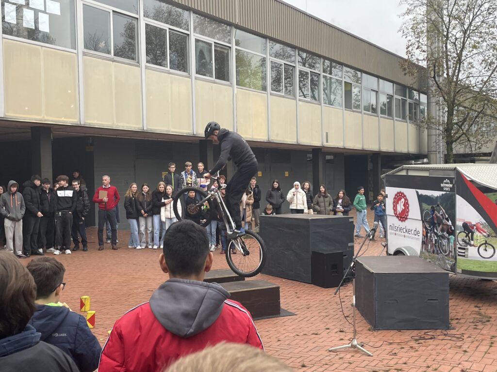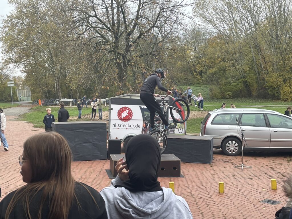Trail Bike-World Cup-Teilnehmer Nils Riecker hat für etwas Abwechslung in der Hofpause gesorgt. Er kam im Rahmen der ICH GLAUB’S Jugendwoche zu uns, die vom christlichen Jugendverein EC Hemsbach stattgefunden hat.